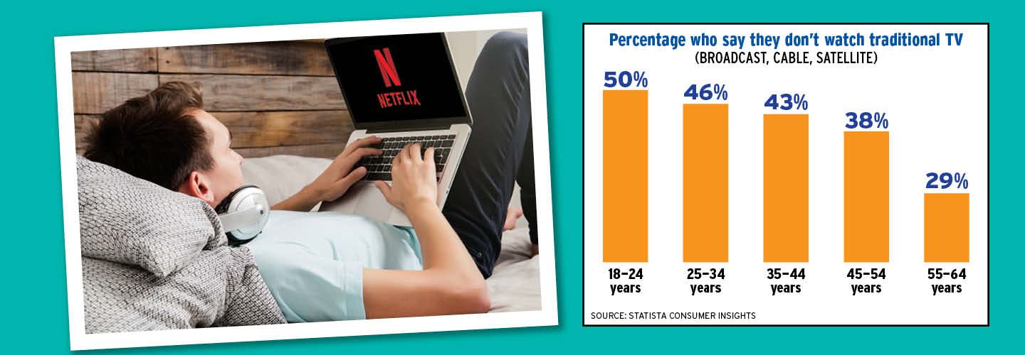 Percentage who say they don’t watch traditional TV (Broadcast, cable, satellite): 18–24 years: 50%; 25–34 years: 46%; 35–44 years: 43%; 45–54 years: 38%; 55–64 years: 29%. Source: Statista Consumer Insights | Photo: Shutterstock.com