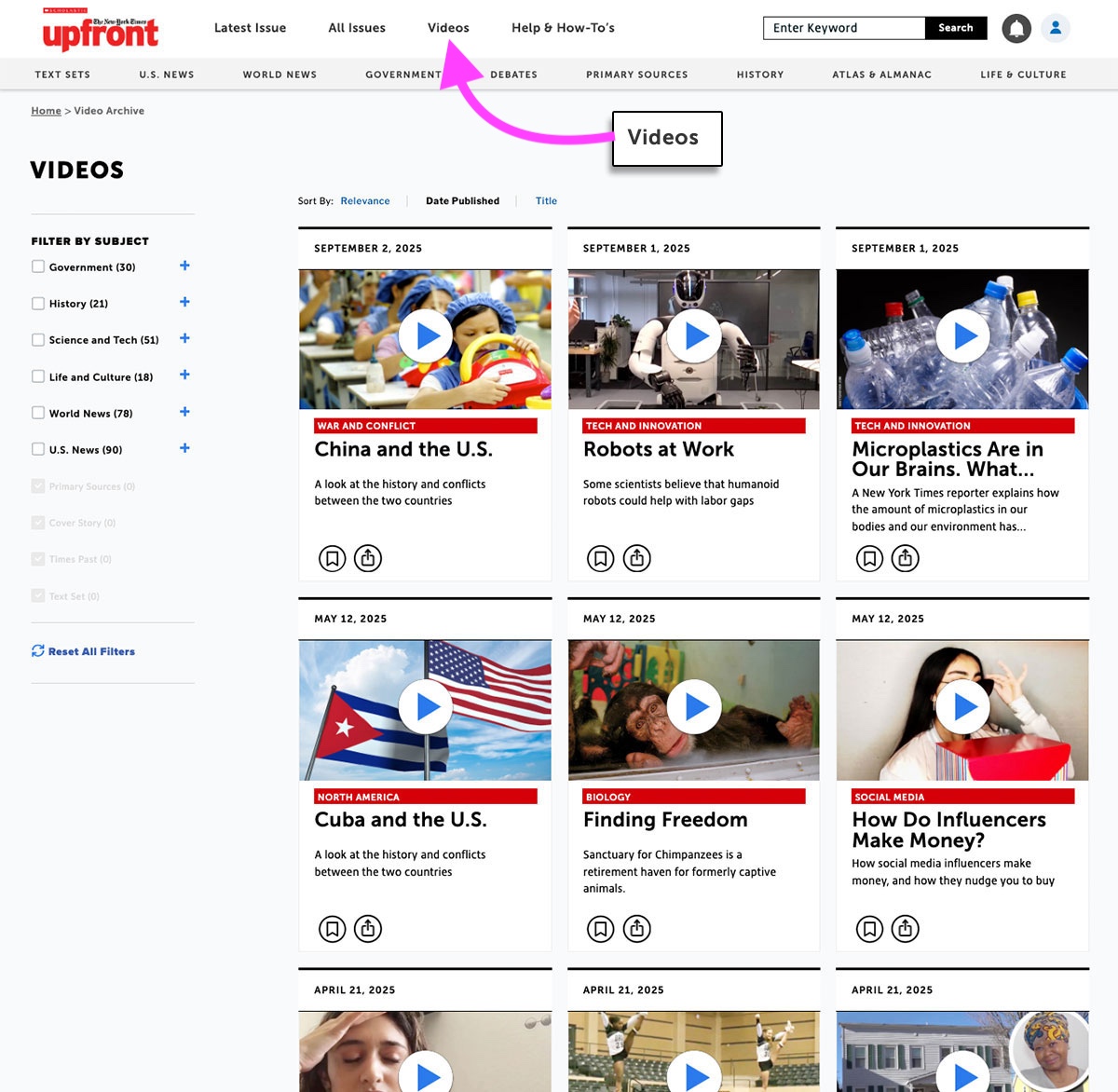 Looking for something specific? Use the search bar at the top right of any Upfront page. Then use the left-hand menu to filter results by type (article, video, etc.) or by subject. You can also sort by relevance, date published, or title.