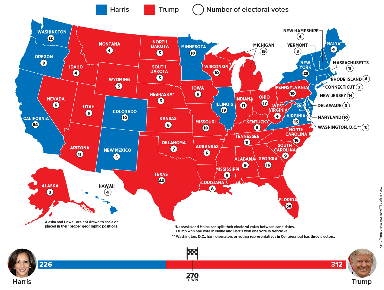 Vice President Kamala Harris, the Democratic nominee, and her running mate, Minnesota Governor Tim Walz, have won 224 electoral votes.
